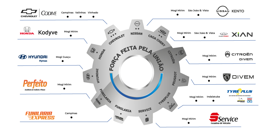 Possui uma área operacional de 128 (cento e vinte e oito) cidades e um grande estoque de semi novos multimarcas, linha 0KM, departamento de peças, acessórios originais e departamento de seguros e financiamento.